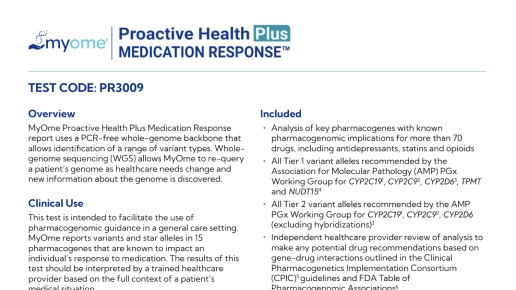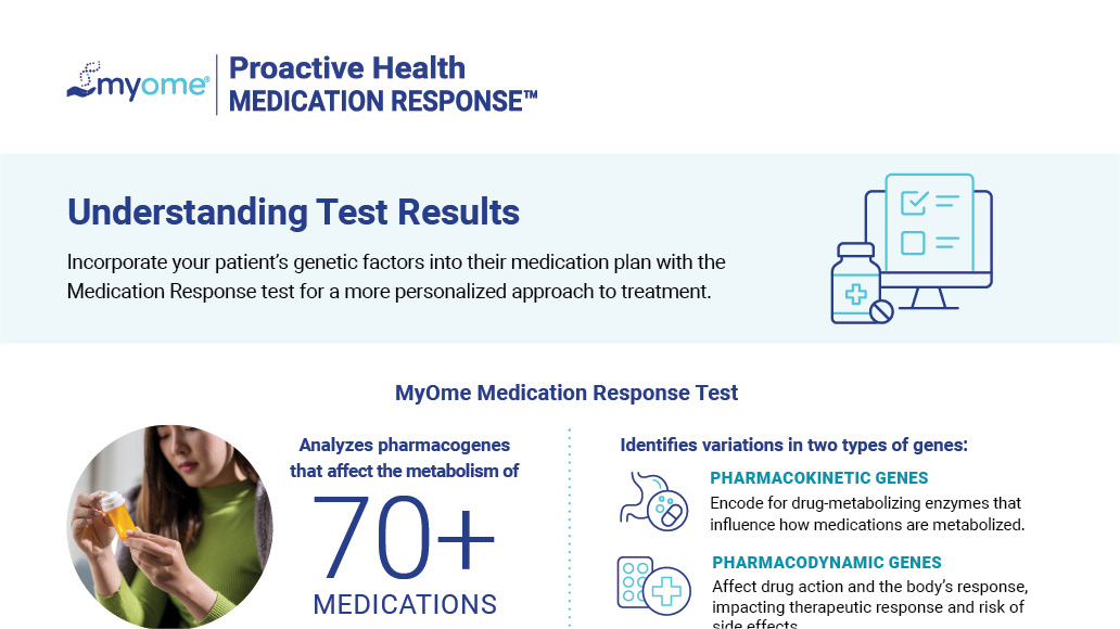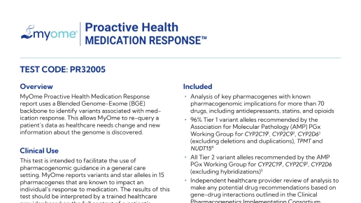 In addition to the Medication Response results, factors such as a patient's current medications, age, weight, kidney and liver function, diet, and other untested genes or variants can influence response to treatment. Results should be interpreted within the context of the patient's full medical profile. MyOme offers genetic counseling to provide a more comprehensive assessment and personalized medication management.