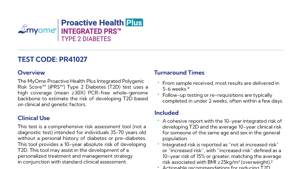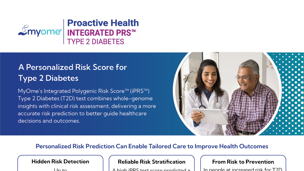 The MyOme Integrated Polygenic Risk Score™ (iPRS™) for Type 2 Diabetes combines whole-genome insights with clinical factors—such as age, sex, BMI, blood pressure, cholesterol, and lifestyle—to provide a person’s absolute 10-year risk of developing T2D. This integrated approach is more accurate than clinical factors alone, enabling earlier and more personalized prevention strategies. The test has been validated across multiple ancestries to ensure broad applicability.